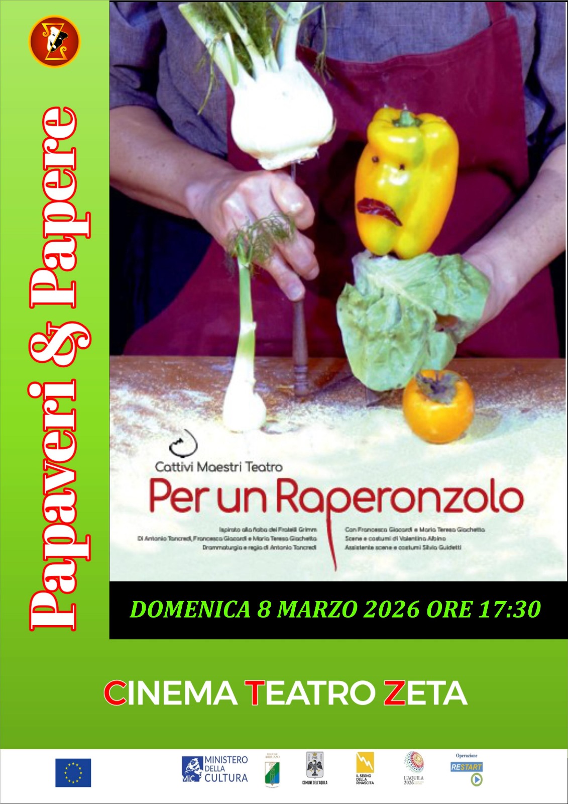 A raccontare la storia di Raperonzolo sono due cuoche che stanno preparando una torta. Sul banco della piccola cucina vengono portati tutti gli ingredienti. È tutto pronto quando il desiderio di un caffè, interrompe la preparazione. Ma il lavoro incalza, non ci si può fermare e desiderare, avere voglia di qualcos’altro può essere fonte di guai, come per quei due contadini che per la voglia di raperonzoli persero una figlia. Ma non si può richiamare una storia senza raccontarla tutta. E così, tra un caffè e la preparazione della torta, (di cui il pubblico potrà apprezzare anche i profumi) le due cuoche non smettono di raccontare e interrogarsi su quella storia così strana che ha inizio con un desiderio, quello di avere un figlio, e una voglia, quella di raperonzoli cresciuti nell’orto di una fata. Le due cuoche raccontano e fanno vivere la fiaba di Raperonzolo utilizzando ortaggi, mestoli, cucchiai, ciò che trovano sul bancone. Sono partecipi della sorte dei protagonisti fino a intervenire prendendo parte ad una storia che parla anche di loro e di noi tutti.