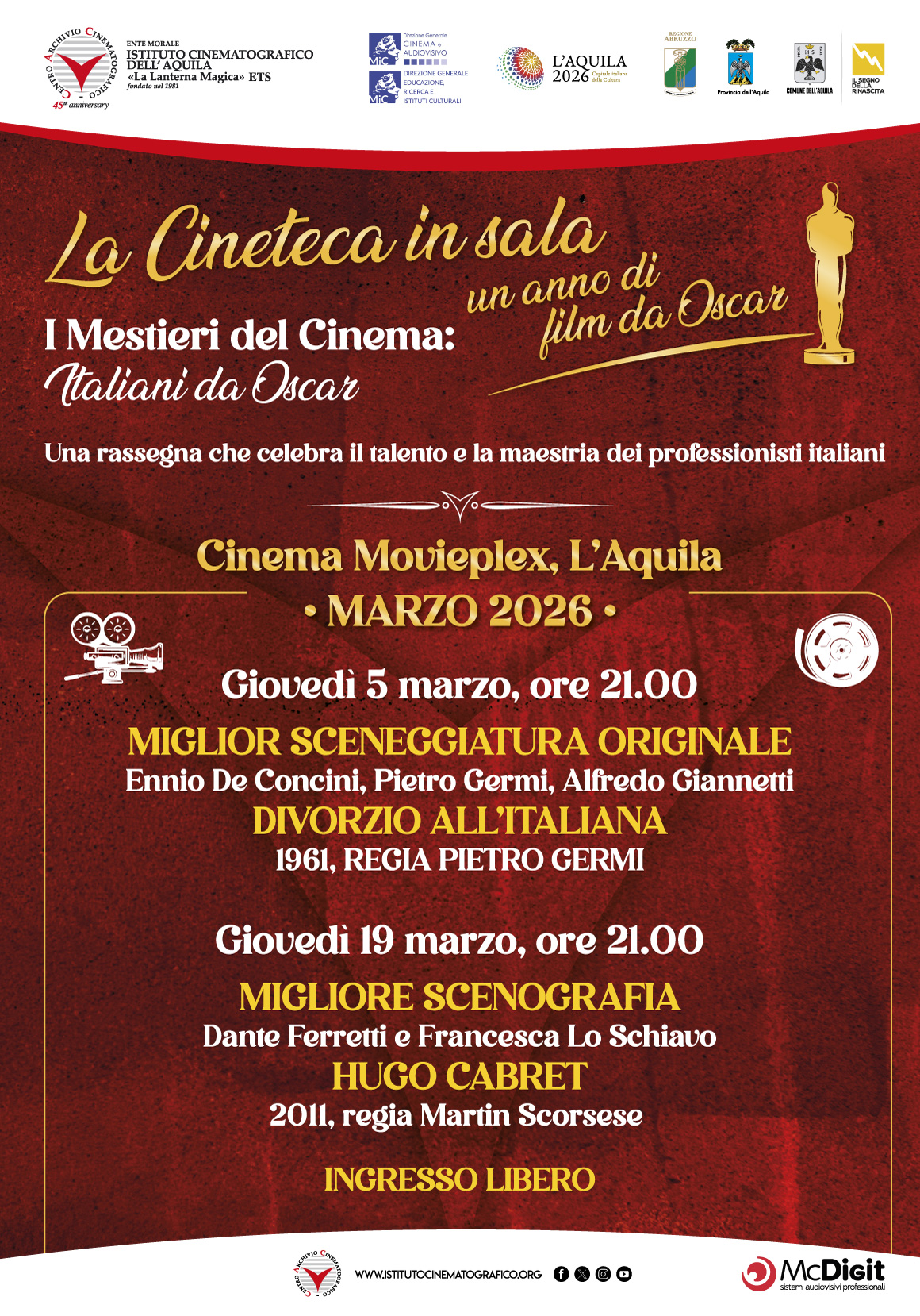 Migliori costumi Gabriella Pescucci, -L’età dell’Innocenza, 1993, regia Martin Scorsese Una rassegna che celebra il talento e la maestria dei professionisti italiani che hanno contribuito in modo significativo alla cinematografia mondiale, vincendo l’Oscar. Questa rassegna mette in luce le figure chiave del cinema italiano, non solo registi, ma anche attori, sceneggiatori, direttori della fotografia, montatori…
