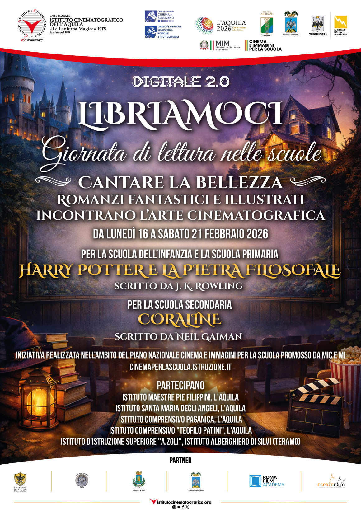 Progetto DIGITALE 2.0 dell’Istituto Cinematografico dell’Aquila, realizzato nell’ambito del “Piano Nazionale Cinema e Immagini per la Scuola” 2024 promosso dal Ministero dell’Istruzione e dal Ministero della Cultura. Dal 16 al 21 febbraio “La Lanterna Magica” proporrà, presso le classi interessate dal progetto DIGITALE 2.0, un incontro nell'ambito della campagna nazionale Libriamoci, promossa dal Centro per…