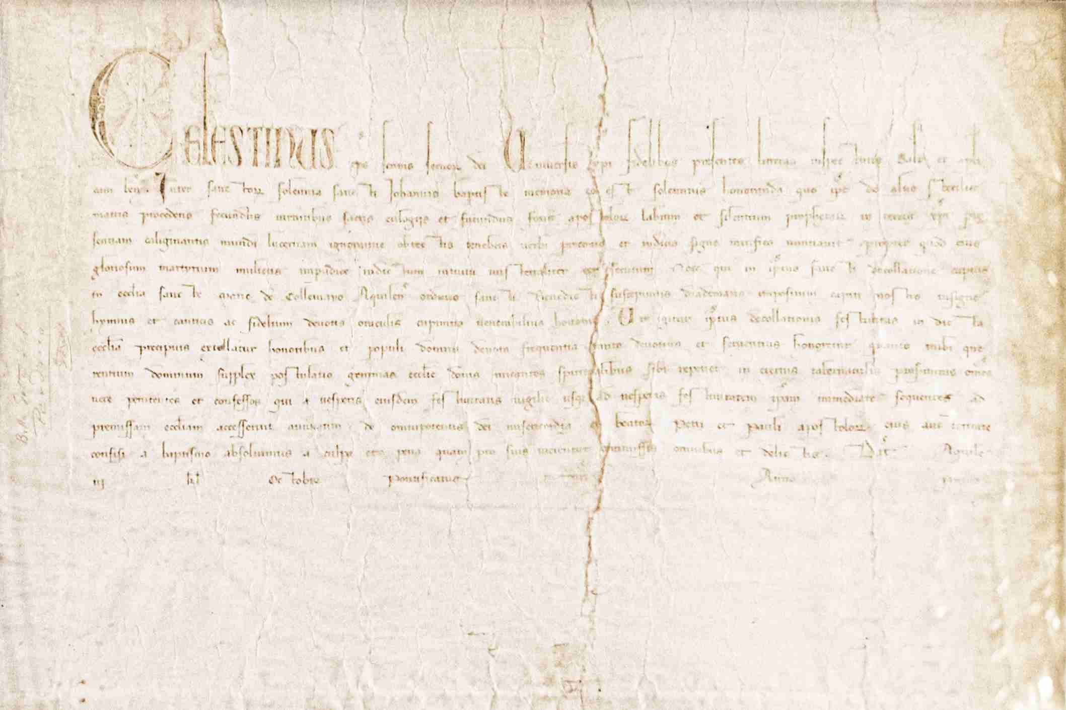 «Celestinus episcopus, servus servorum Dei, universis Christi fidelibus presentes litteras inspecturis, salutem et apostoli/cam benedictionem. Inter santorum solennia sancti Johannis Baptiste memoria eo est solennius honoranda, quo ipse de alve sterilis / matris procedens fecundus virtutibus, sacris eulogiis et facundus fons, apostolorum labium et silentium prophetarum, in terris Christi pre/sentiam, caliginantis mundi lucernam, ignorantie obtectis, tenebris, verbi preconio et indicis signo mirifico nuntiavit, propter quod eius / gloriosum martyrium mulieris impudice indictum intuitu misteraliter et secutum. Nos qui in ipsius Sancti decollatione capitis / in ecclesia sancte Marie de Collemayo Aquilensi, ordinis sancti Benedicti, suscepimus diadematis impositum capiti nostro insigne, / hymnis et canticis ac fidelium devotis oraculis cupimus venerabilius honorari. Ut igitur ipsius decollationis festivitas in dicta / ecclesia precipuis extollatur honoribus et populi Domini devota frequentia tanto devotius et ferventius honoretur, quanto inibi que/rentium Dominum supplex postulatio gemmas Ecclesie donis micantes spiritualibus sibi reperiet in eternis tabernaculis profuturas, omnes / vere penitentes et confessos qui a vesperis eiusdem festivitatis vigilie usque ad vesperas festivitatem ipsam immediate sequentes ad / premissam ecclesiam accesserint annuatim et omnipotentis Dei misericordia et beatorum Petri et Pauli apostolorum eius auctoritate / confisi a baptismo absolvimus a culpa et pena quam pro suis merentur commissis omnibus et delictis. Datum Aquile / III kalendas octobris, pontificatus nostri anno primo»