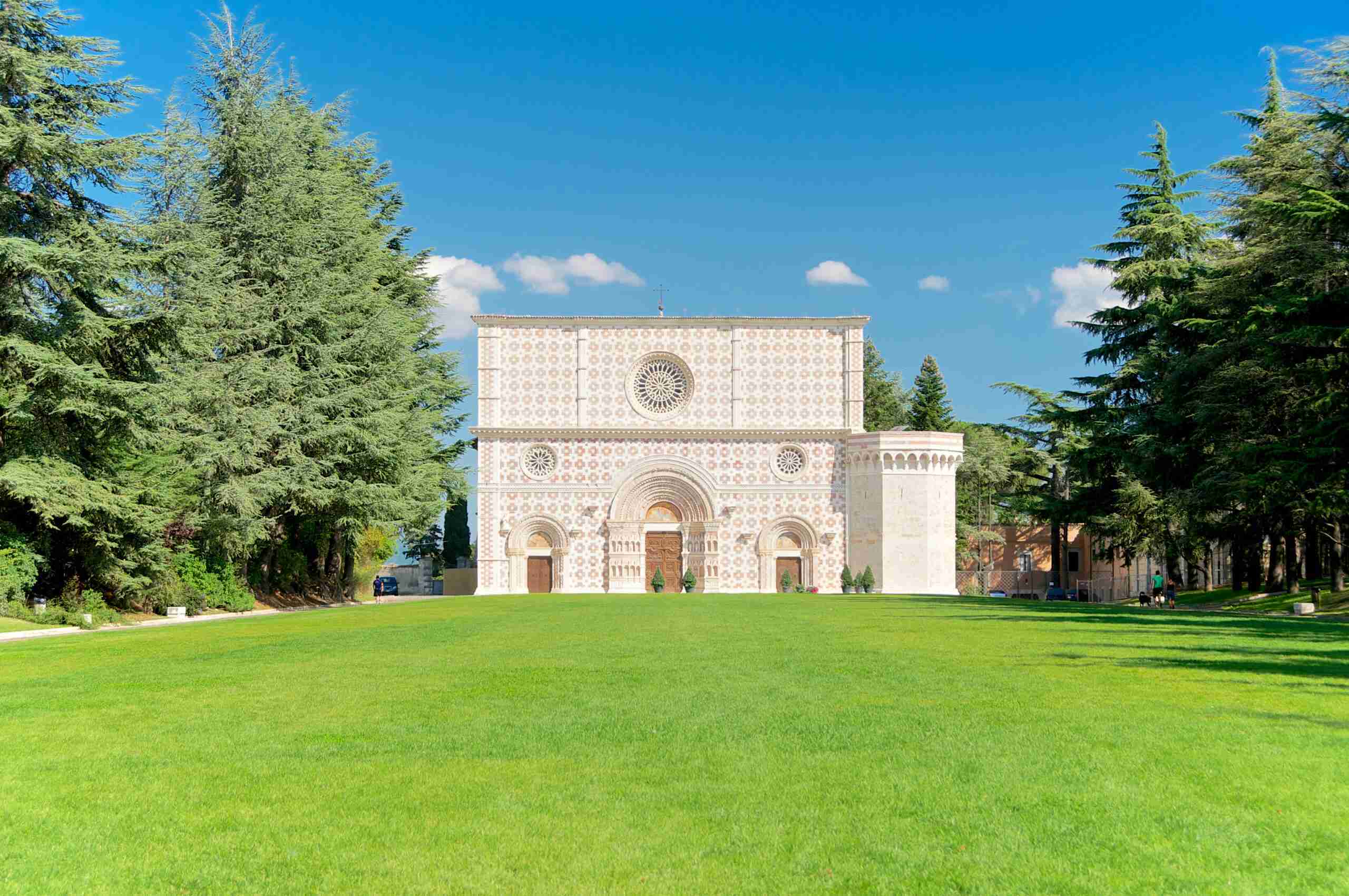 La basilica di Santa Maria di Collemaggio è considerata la massima espressione dell’architettura abruzzese. Venne edificata nel 1288 per volere di Pietro da Morrone che, il 29 agosto 1294, vi fu incoronato papa con il nome di Celestino V. Sulla facciata laterale, a sinistra guardando quella principale, si trova la Porta Santa. L’interno ospita le spoglie del santo, conservate nel mausoleo realizzato nel 1517 da Girolamo da Vicenza, maestro di Andrea Palladio. La basilica è sede e simbolo della Perdonanza Celestiniana, l’unico giubileo annuale, istituito dallo stesso Celestino V con la Bolla del Perdono del 29 settembre 1294, che si svolge dal 23 al 29 agosto di ogni anno ed è inserita nella lista UNESCO dei patrimoni immateriali dell’umanità dal 2019.